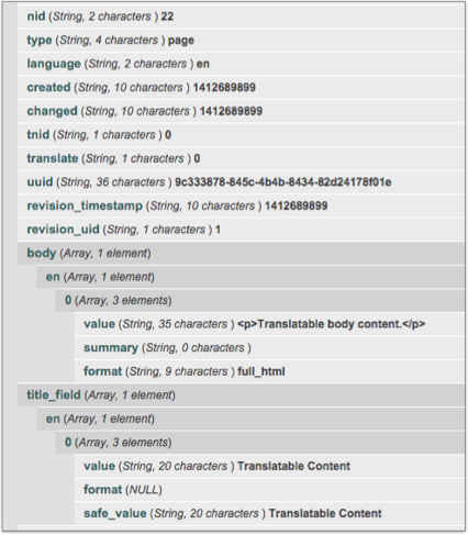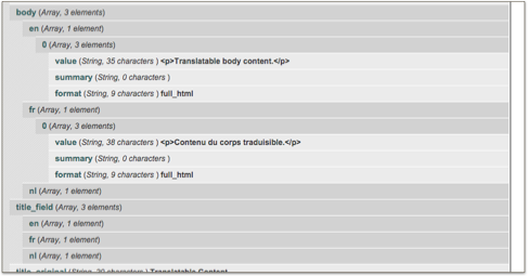 • Translated fields have a value for each language (in this case ‘en’ and ‘nl’).