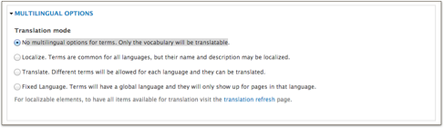 Translation mode: "no multilingual options for terms. Only the vocabulary will be translatable"