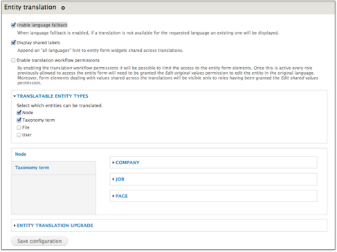 Open “translatable entity types” fieldset and click the entity types that must be translated.