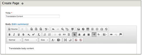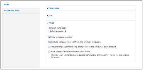 In this example, the default language is ‘English’ and we create content of content-type ‘Page’. The steps for taxonomy terms and other content bundles are the same.